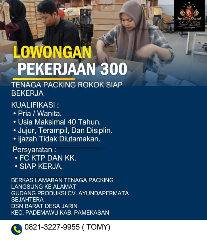 CV Ayunda Permata Sejahtera Pamekasan Buka 300 Lowongan Packing Rokok, Daftar Segera ke 0821-3227-9955
