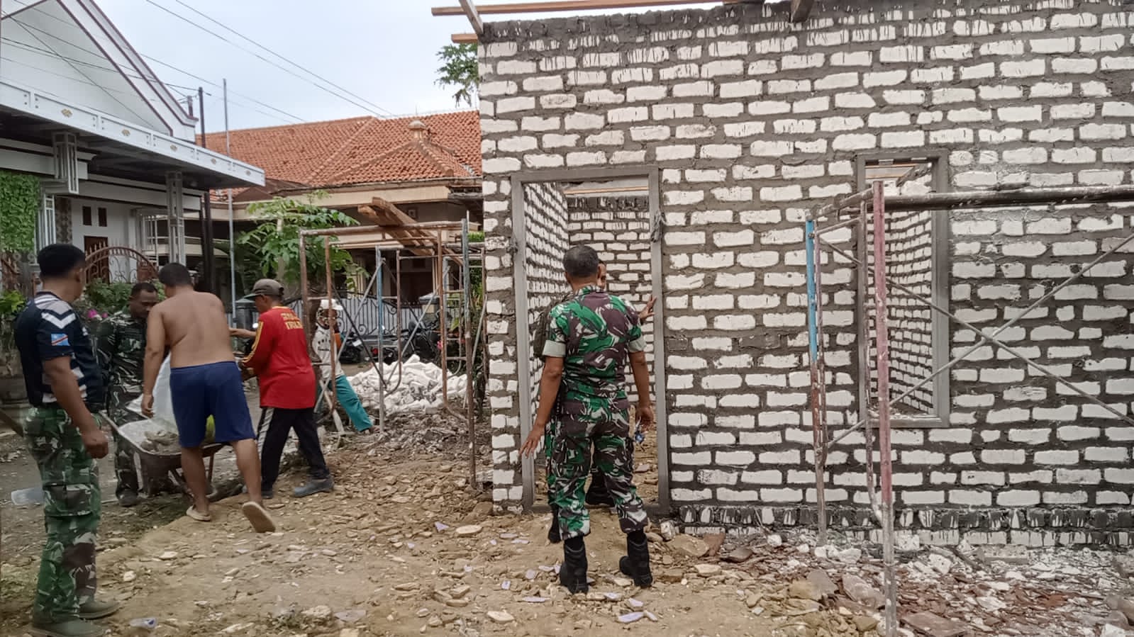 Anggota Koramil Pademawu Kodim 0826 Pamekasan dan CV Ayunda Permata Sejahtera Tunjukkan Semangat Gotong Royong Percepat Bangun Rumah Lansia 73 Tahun