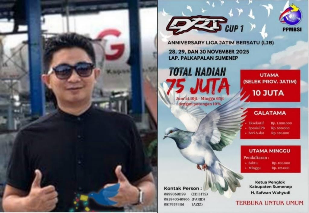 SUMENEP — Dunia hobi merpati balap yang terbang tinggi di Jawa Timur kembali mendapat panggung bergengsi. Melalui gelaran DRT CUP 1 dalam rangka Anniversary Liga Jatim Bersatu (LJB), para pemain merpati dari berbagai daerah dipastikan akan memeriahkan kompetisi yang dijadwalkan berlangsung pada 28–30 November 2025 di Lapangan Palkapalan, Sumenep.