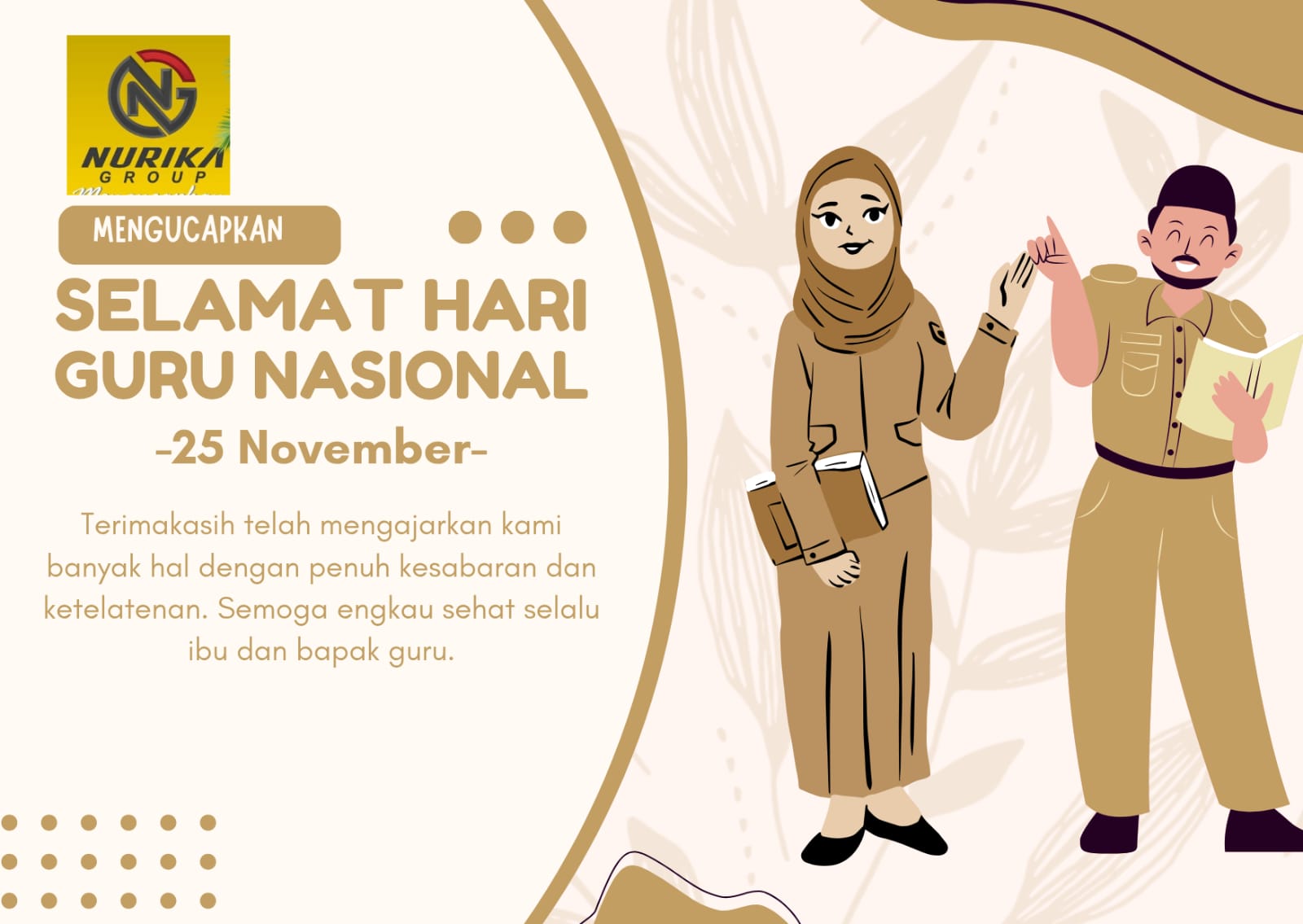 “Selamat Hari Guru Nasional. Para guru adalah pahlawan tanpa tanda jasa yang bekerja dengan penuh kesabaran dan ketulusan. Kami sangat berterima kasih atas dedikasi mereka dalam membimbing anak-anak bangsa,” ungkap Nurika.