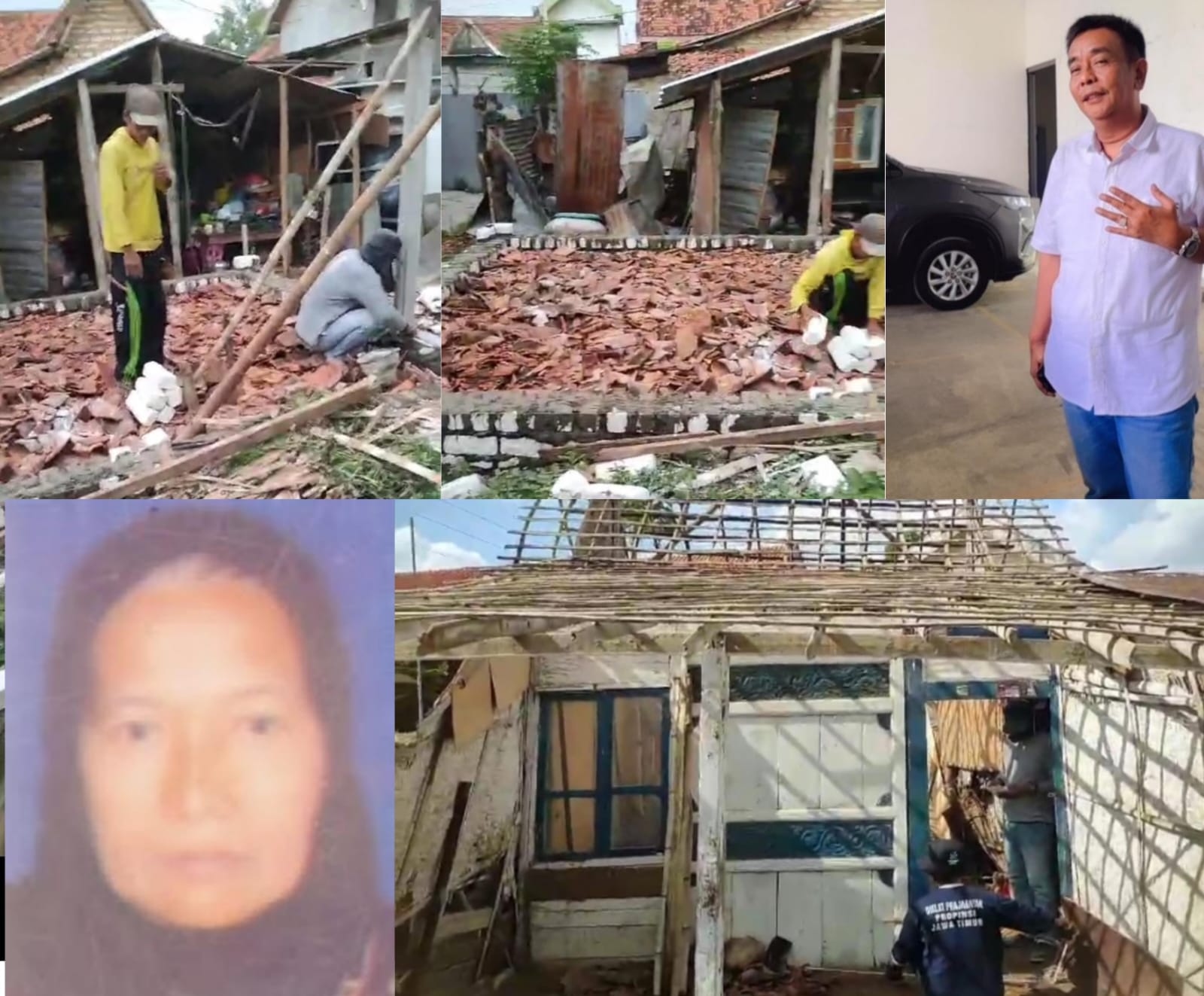 Foto di atas : Proses bedah rumah milik Suhartini (73), Lansia sebatang kara. Foto di bawah : Nenek Suhartini (73) dan rumah tak layak huni saat dilakukan pembongkaran oleh tim CV Ayunda Permata Sejahtera